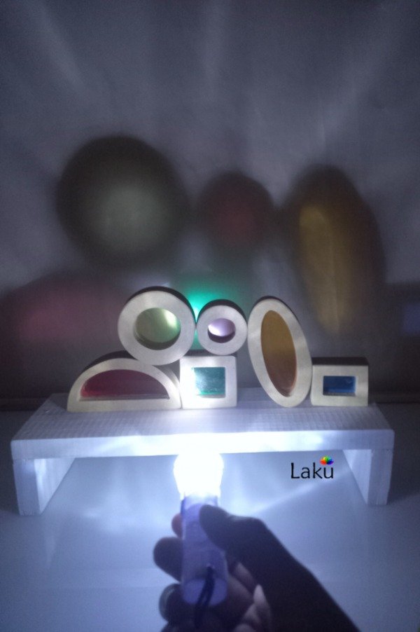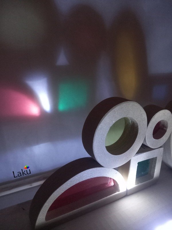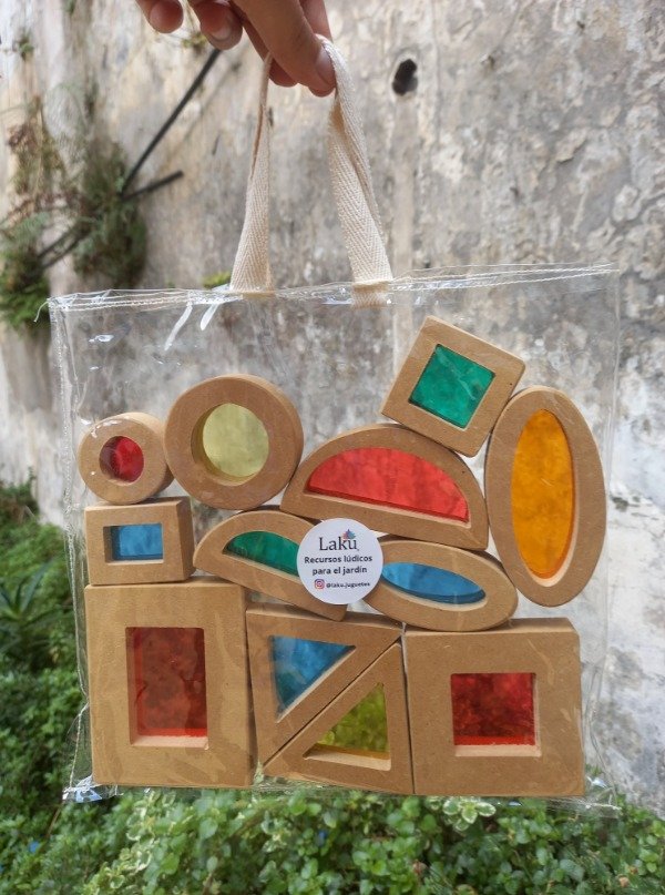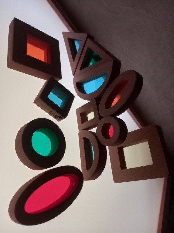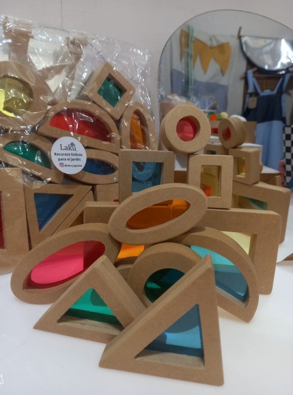 Son bloques de construcción de diferentes formas geométricas, colores y tamaños, con superficies translúcidas que permiten jugar con la luz, los colores y la superposición de tonalidades. Invitan a observar a través de pequeñas ventanas de color, generando una experiencia de descubrimiento visual y táctil.