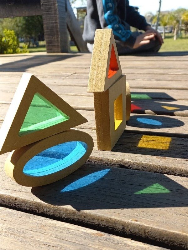 Son bloques de construcción de diferentes formas geométricas y colores, con superficies translúcidas que permiten jugar con la luz, los colores y la superposición de tonalidades. Invitan a observar a través de pequeñas ventanas de color, generando una experiencia de descubrimiento visual y táctil.